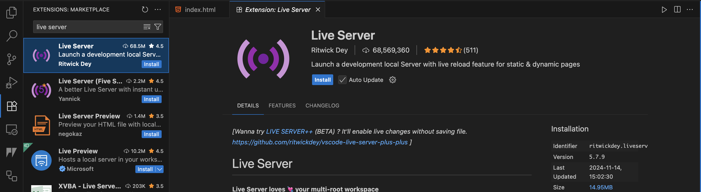 Ctrl+Shift+X/Cmd+Shift+X). - Search Live Server (by Ritwick Dey).